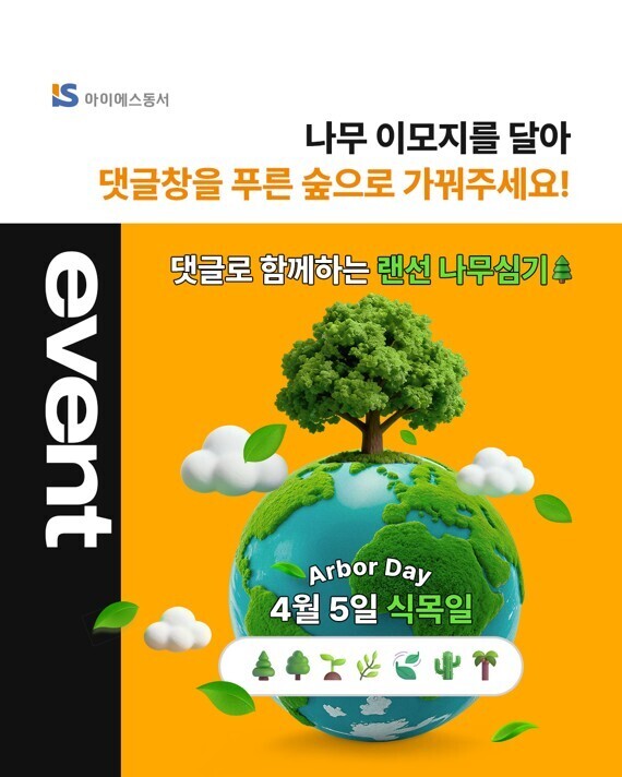 아이에스동서(IS동서)가 식목일을 맞아 오는 4월 5일부터 12일까지 7일간 공식 SNS 채널을 통해 고객 참여형 이벤트를 실시한다.