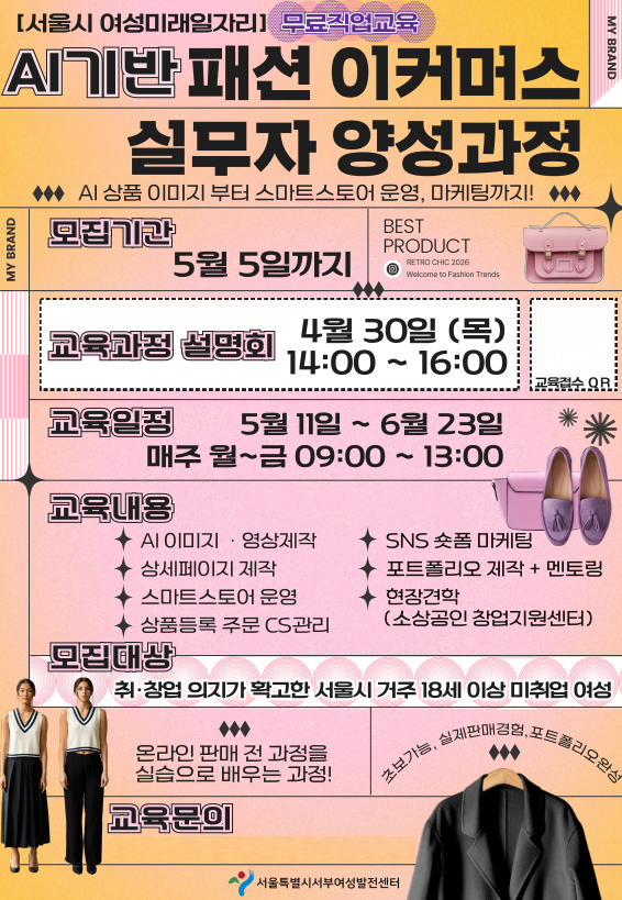 이커머스 창업이나 취업을 꿈꾸지만 어디서부터 시작해야 할지 막막했던 여성들을 위해 서울특별시서부여성발전센터가 실무 중심의 해결책을 제시한다. 센터는 AI 기술을 접목해 온라인 판매의 전 과정을 마스터할 수 있는 ‘AI 기반 패션 이커머스 실무자 양성과정’을 개설하고 오는 5월 5일까지 수강생을 모집한다.
