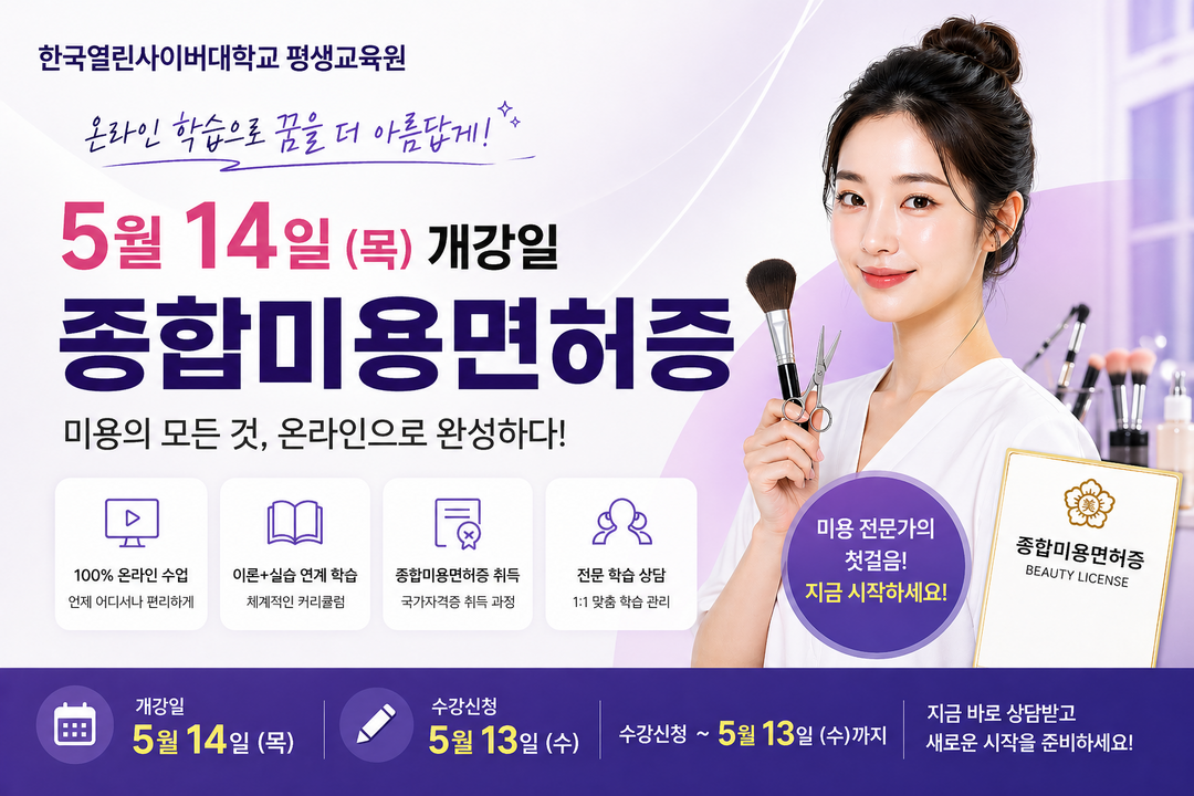 미용 분야 창업이나 취업을 준비하는 이들에게 필요한 자격을 한 번에 갖출 수 있는 ‘종합미용면허증’ 과정이 한국열린사이버대학교 평생교육원을 통해 운영된다. 해당 과정은 5월 13일(수)까지 모집이 진행되며, 5월 14일(목) 개강 예정이다.