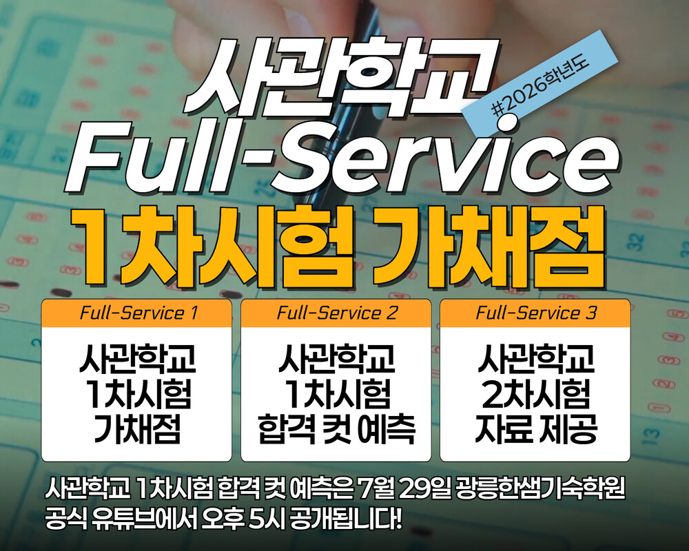 이후 7월 29일(화) 저녁 5시에는 광릉한샘기숙학원 유튜브 채널을 통해 Live로 육군사관학교, 해군사관학교, 공군사관학교, 국군간호사관학교 각각 남녀 계열별 모집단위별 예측 합격컷을 공개한다.