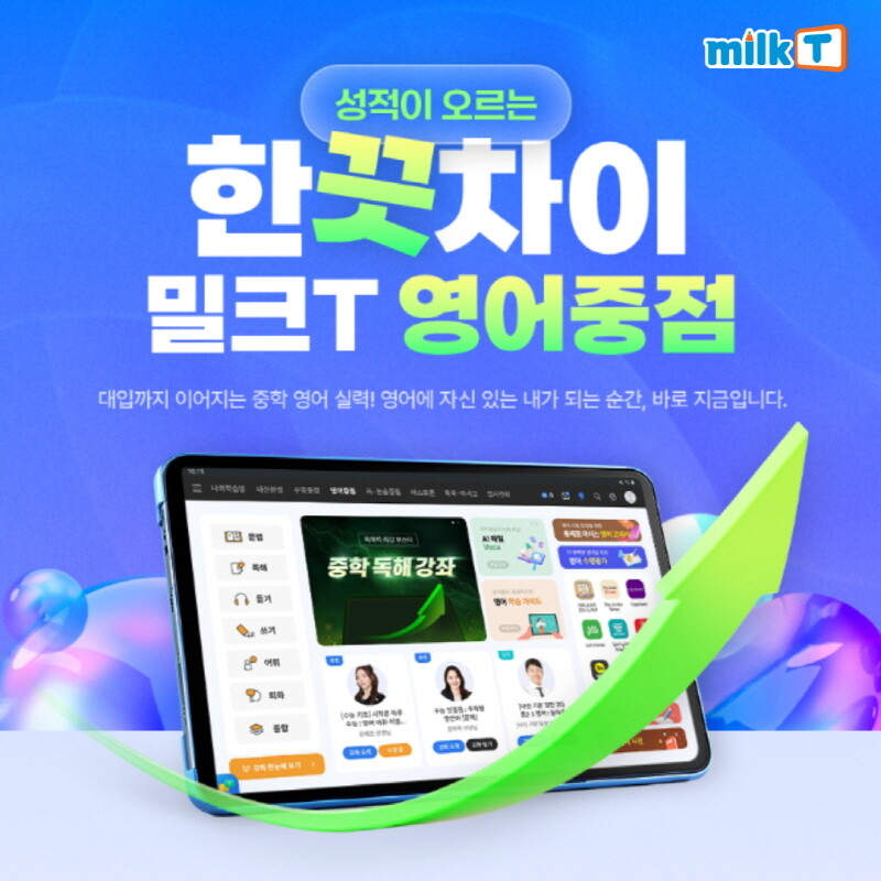 이에 천재교육 관계사 천재교과서가 만든 중등인강 밀크T중학은 중학생의 영어 실력을 체계적으로 끌어올리기 위해 문법·독해·듣기·말하기·회화까지 전 영역을 아우르는 ‘중학 영어 중점’ 콘텐츠를 제공한다고 밝혔다.