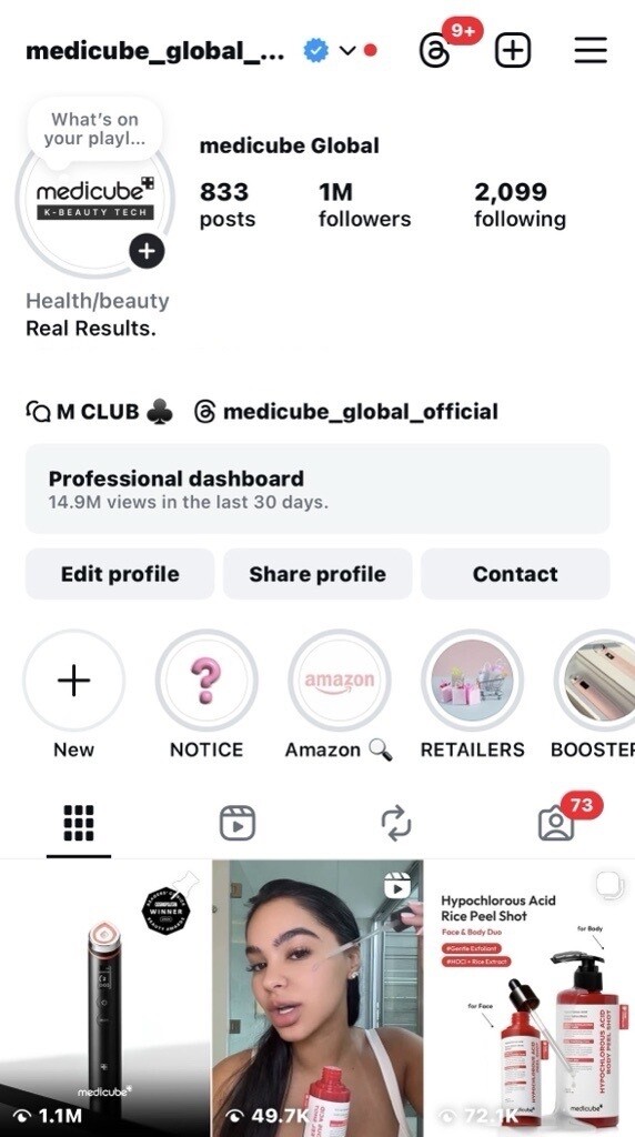 메디큐브는 글로벌 공식 Instagram 계정 팔로워 수가 100만 명을 넘어섰다고 밝혔다. 브랜드 제품 홍보를 넘어 다양한 콘텐츠 형식으로 소비자 체류 시간을 늘린 전략이 성과로 이어졌다는 평가다.