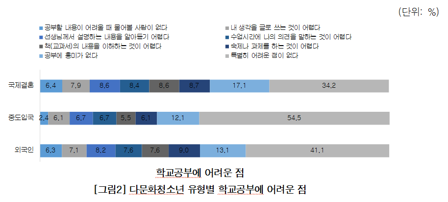 장기 거주 다문화청소년 역시 학업 성취에서는 어려움을 겪는 것으로 조사됐다.
