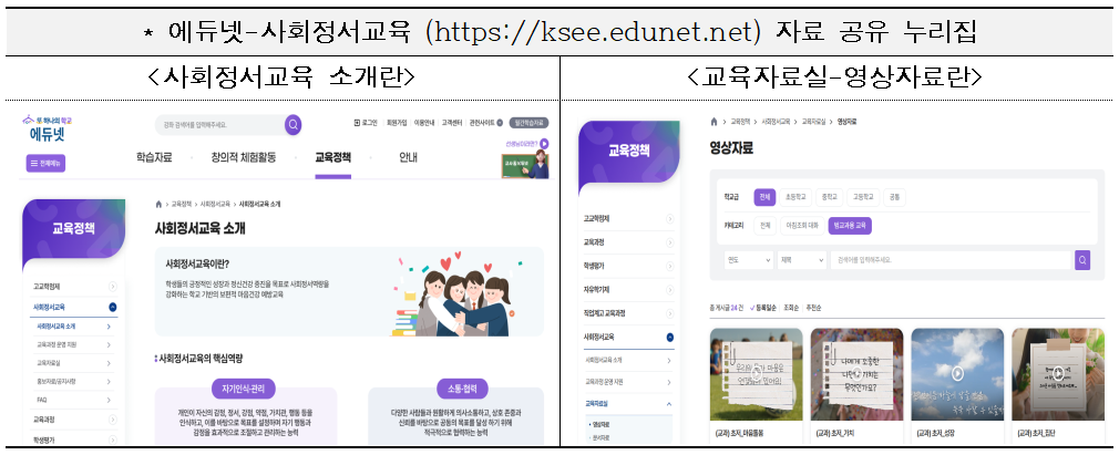 이들 콘텐츠는 1월 29일 개통하는 에듀넷 내 사회정서교육 전용 서비스에 탑재된다. 전용 서비스에는 사회정서교육 개요와 교육과정, 학교급별 프로그램, 영상 콘텐츠, 우수 실천사례집, 교사연구회 결과물 등이 함께 제공돼 학교는 물론 가정에서도 자유롭게 활용할 수 있도록 했다.