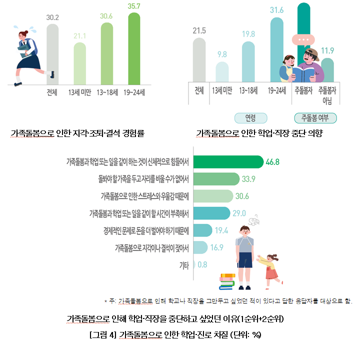 학업이나 일을 포기하고 싶었던 이유로는 신체적 피로(46.8%), 가족을 두고 자리를 비울 수 없음(33.9%), 스트레스와 우울감(30.6%) 등이 꼽혔다.