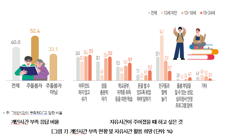 개인시간 부족을 느낀다는 응답은 40.0%였고, 주 돌봄자의 경우 52.4%로 절반을 넘었다. 자유 시간이 생기면 “친구와 놀고 싶다”, “아무것도 하지 않고 쉬고 싶다”, “잠을 자고 싶다”는 응답이 많았다.