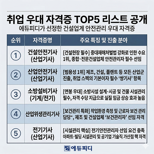 건설 현장의 안전관리자 선임 필수 자격증으로, 채용 공고에서 가장 압도적인 우대 순위를 차지한다. 에듀피디 관계자는 “건설 공종의 특수성을 이해하고 재해 예방 계획을 수립하는 데 필수적인 자격”이라고 설명했다.