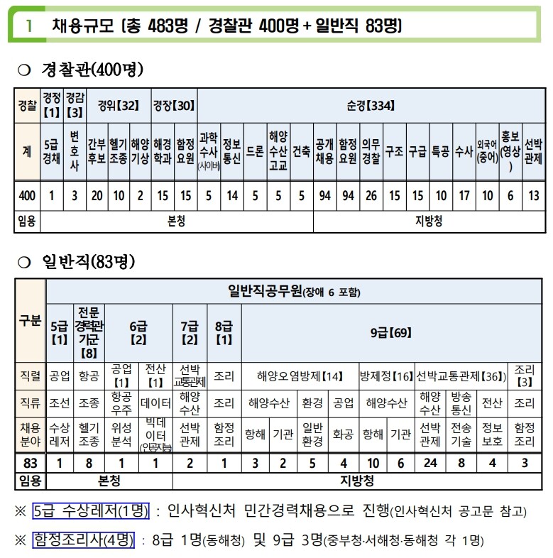일반직은 총 83명으로 ▲5급 수상레저 1명 ▲전문경력관 가군 헬기조종 8명 ▲6급 위성분석·빅데이터(인공지능) 2명 ▲7급 선박관제 2명 ▲8급 함정조리 1명 ▲9급 항해·기관·선박관제 등 69명을 채용한다.