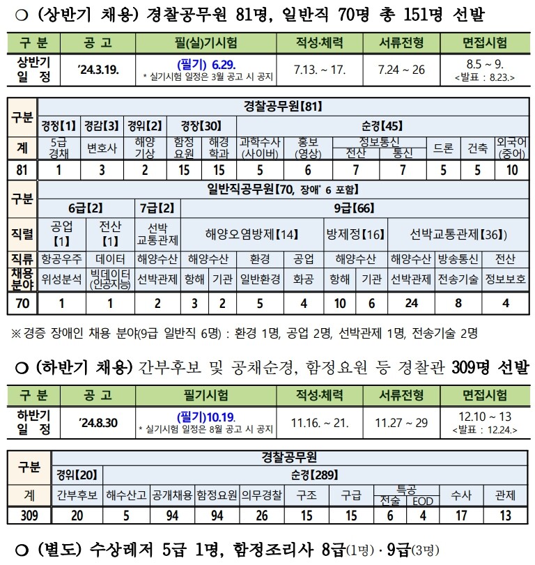 하반기 채용은 간부후보 및 공채순경, 함정요원 등 경찰관 총 309명을 선발한다. 구체적인 일정은 8월 30일에 공고된다.