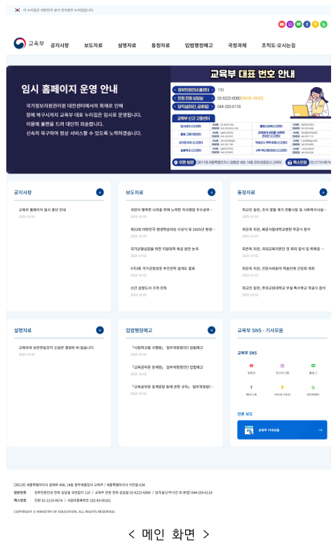 교육부는 이번 임시 누리집에서 ▲교육부 대표 전화번호 안내 ▲공지사항 ▲보도·설명자료 ▲입법·행정예고 ▲국정과제 등 국민들이 일상적으로 확인하는 주요 공공 정보 제공 기능에 집중해 운영할 방침이다.
