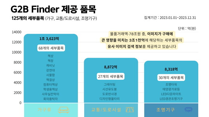 현재 G2B 파인더(지투비파인더)는 가구류, 교통시설, 조명기구 등 125개 세부 품목에 대한 서비스를 제공하고 있다. 앞으로 그 범위를 점차 확대해 공공 조달 시장 전반의 투명성과 공정성을 높여나갈 계획이다.