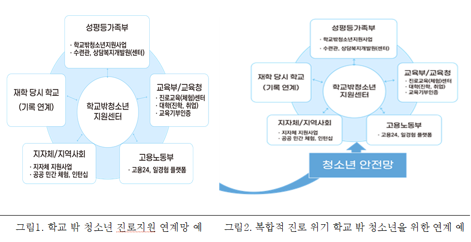 연구 보고서는 학교 밖 청소년의 복합적인 위기를 해결하기 위해 관계 부처와 기관이 유기적으로 협력하는 ‘다체계 연계망’ 구축을 최우선 과제로 꼽았다. 학교밖청소년지원센터를 중심으로 성평등가족부, 교육부, 지자체, 고용노동부 등이 칸막이를 허물고 청소년 안전망 안에서 정보를 공유해야 한다는 설명이다.