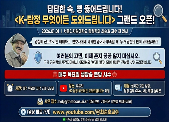 | ▲"경찰이 못하는 일, 우리가 합니다"라는 슬로건을 내건 유튜브 채널 ‘K-탐정 무엇이든 도와드립니다’ 공식 썸네일. 최순호 교수가 탐정의 공익적 역할을 강조하고 있다.[사진제공=서울디지털대학교] |