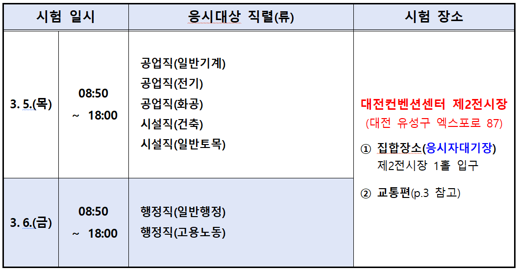 면접시험은 3월 5일과 6일 이틀간 대전컨벤션센터 제2전시장에서 진행된다. 첫날인 5일에는 공업직(일반기계·전기·화공)과 시설직(건축·일반토목) 응시자를 대상으로 면접이 실시되며, 6일에는 행정직 일반행정과 고용노동 직렬 응시자가 면접에 응한다. 응시자는 반드시 본인이 해당하는 직렬의 면접일자를 확인해야 한다.