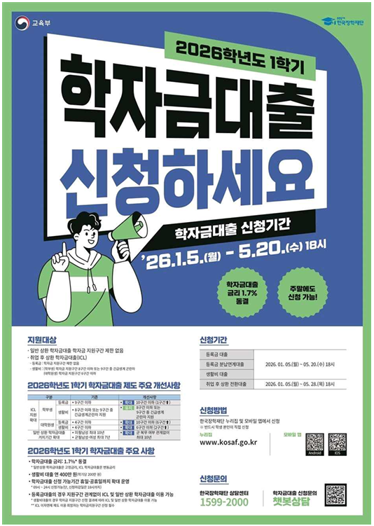 [피앤피뉴스=마성배 기자] 새 학기를 앞두고 대학생과 대학원생의 학비 부담을 덜어줄 학자금대출 신청이 본격적으로 시작된다. 교육부와 한국장학재단은 2026학년도 1학기 학자금대출 신청을 1월 5일부터 받는다고 밝혔다.