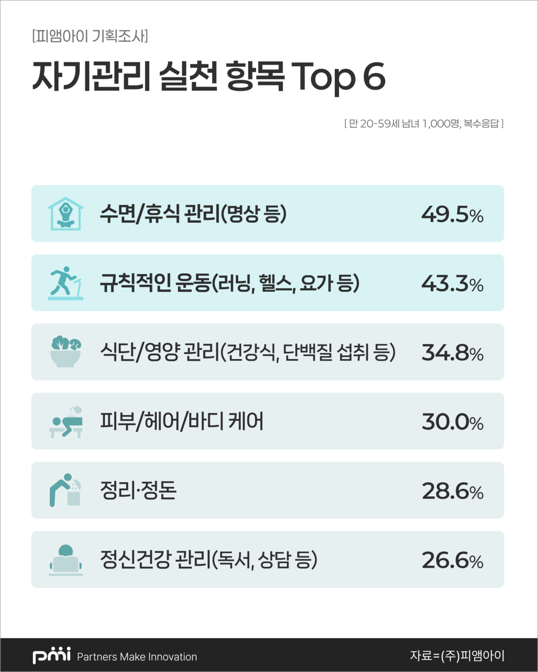 데이터 컨설팅 기업 ㈜피앰아이(PMI)가 전국 만 20~59세 남녀 1,000명을 대상으로 실시한 ‘자기관리에 대한 인식 조사’ 결과를 30일 발표했다.