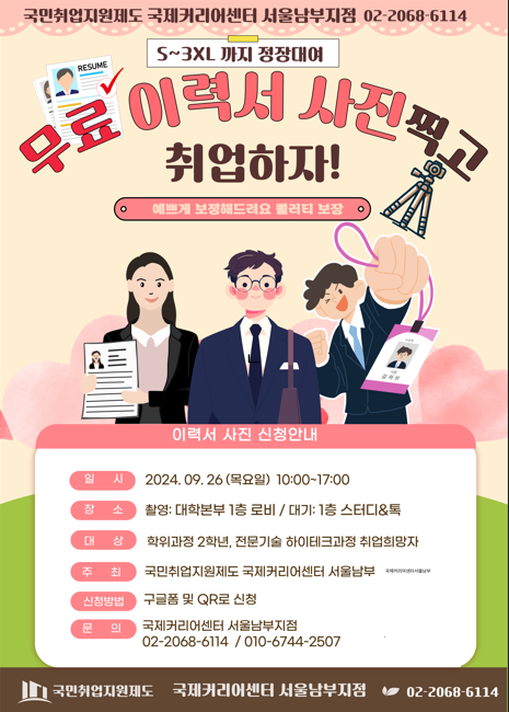 2024년 한국폴리텍대학 서울강서캠퍼스와 MOU 협약 후 인연을 맺어온 고용서비스 우수 기관인 ㈜국제커리어가 지원에 나서 행사 기간 중 6~7일 양일간 ‘이력사 사진찍고 취업하자’ 행사를 지원했다.