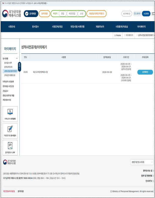| ▲국가공무원채용시스템 홈페이지 내 성적 사전공개/이의제기 |