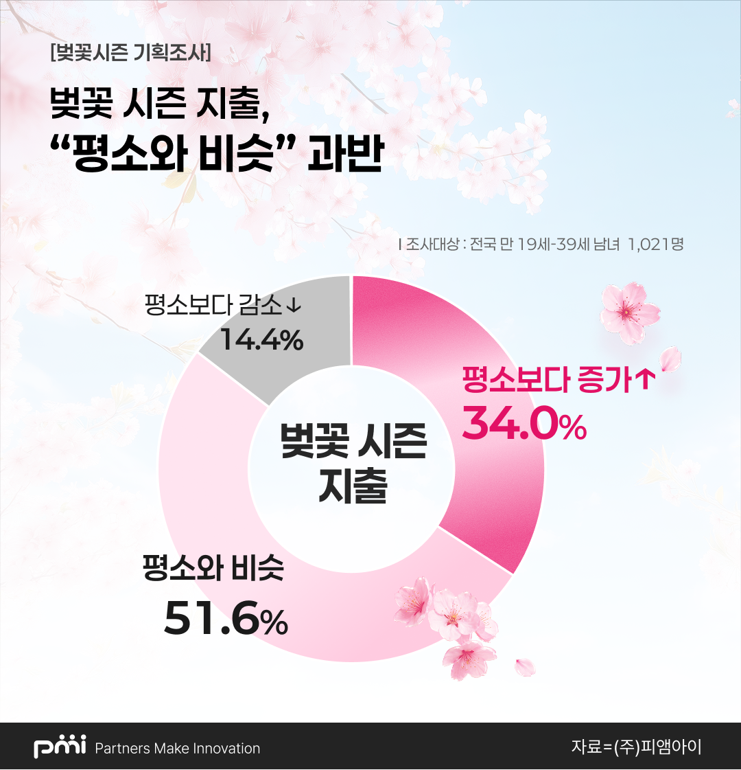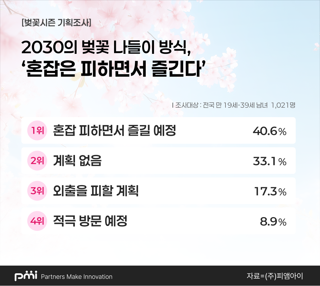데이터 컨설팅 기업 피앰아이(PMI)는 전국 만 19세부터 39세 사이의 남녀 1,021명을 대상으로 벚꽃 시즌 관련 인식을 조사했다. 이번 조사는 개화기를 맞이한 청년층의 여가 성향 변화와 실제 소비 패턴의 흐름을 면밀히 분석하기 위해 실시됐다.