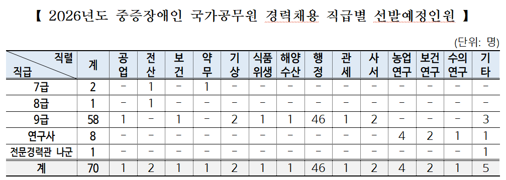[피앤피뉴스=마성배 기자] 행정·기상·사서 등 다양한 분야에서 올해 중증장애인 국가공무원 70명이 선발된다.