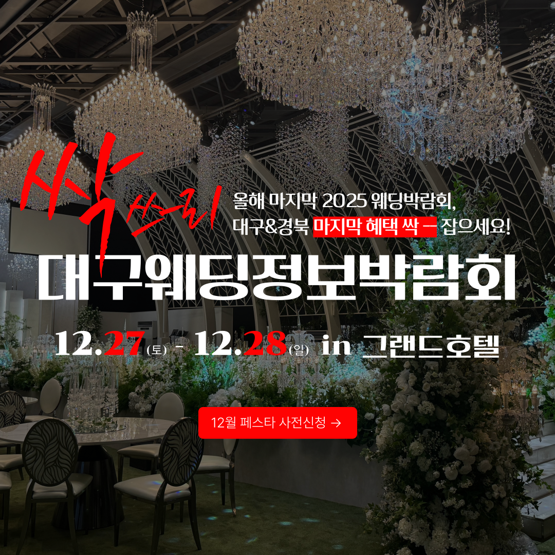 가장 바쁜 연말, 대구웨딩정보박람회가 12월 27~28일 대구 그랜드호텔 B1에서 열린다. 여러 곳을 돌아다닐 필요 없이 짧은 동선으로 결혼 준비를 압축한다.