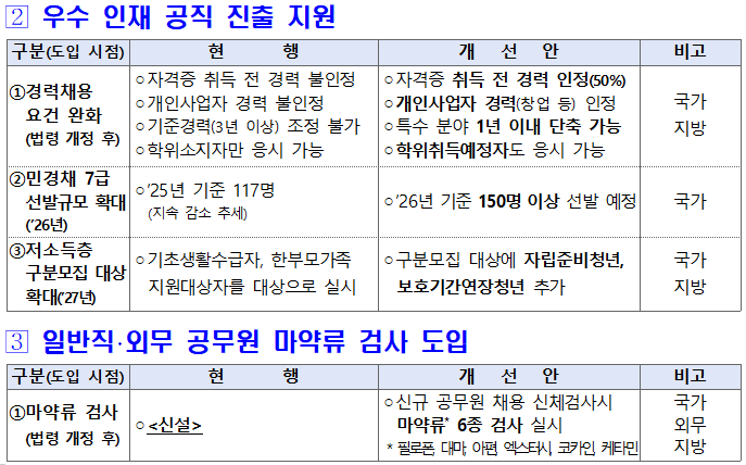 이와 함께 국가공무원 민간경력자 일괄채용시험 7급 선발 규모는 확대되고, 9급 공채 저소득층 구분모집 대상에는 자립준비청년과 보호기간연장청년이 새로 포함된다. 경제적으로 취약한 청년층의 공직 진입 기회를 넓히는 조정이다.