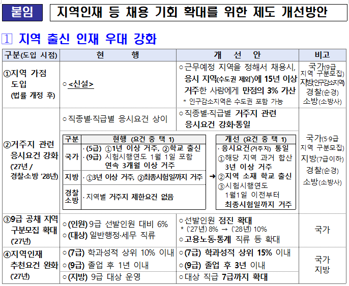 이번 개편에서 가장 크게 달라지는 부분은 지역 가점제도다. 국가직 9급 지역 구분모집과 지방직 7급 이하 공채, 경찰 순경 공채, 소방사 공채처럼 근무 예정 지역을 정해 선발하는 경우, 수도권을 제외한 해당 지역에 장기간 거주한 지원자에게 필기시험 과목별 만점의 3%를 가산한다. 적용 기준은 응시 지역 15년 이상 거주다.