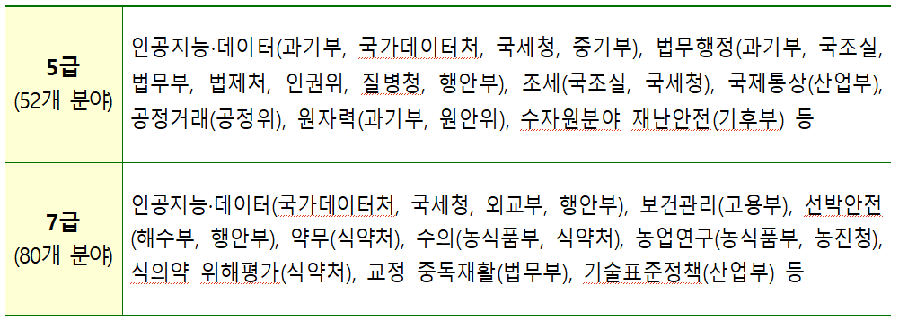 이 밖에도 기상청의 기상·해양기상, 기후에너지환경부의 수자원 재난안전, 법제처의 법제정책, 산업통상자원부의 기술표준과 국제통상, 질병관리청의 보건의료정책 등 정책 전반에 걸친 전문 직무가 포함됐다.