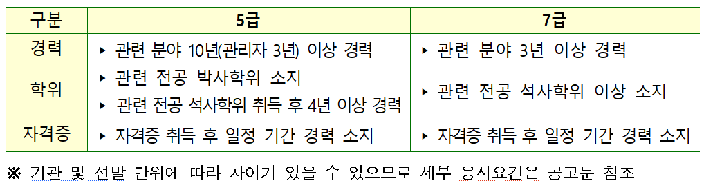 5급은 관련 분야 10년 이상 경력(관리자 3년 포함) 또는 박사학위, 석사학위 취득 후 4년 이상 경력이 필요하다. 7급은 3년 이상 경력이나 석사학위 이상이면 지원할 수 있다. 자격증을 보유한 경우 일정 기간 경력 요건을 충족해야 한다.