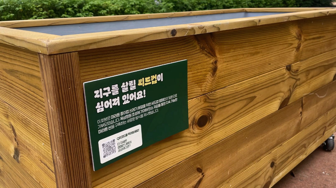 버려진 컵 속 씨앗들이 옥상 화분에 심어져 도심 속 녹지로 다시 태어나며, “마라톤 쓰레기가 도시 정원이 되는 선순환 구조”를 현실로 만들었다.