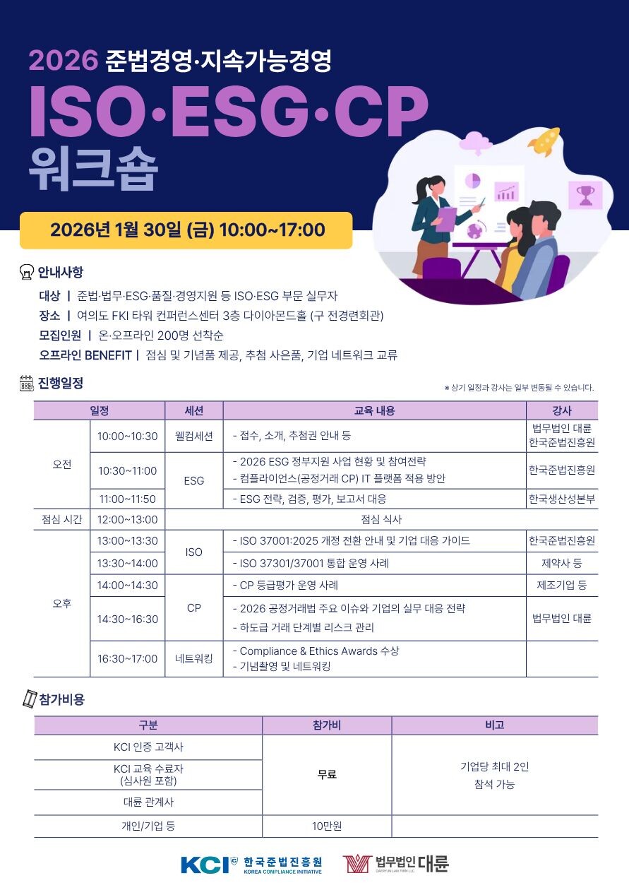 한국준법진흥원(KCI)이 법무법인 대륜과 공동으로 ‘2026 준법경영·지속가능경영 ISO·ESG·CP 통합 워크숍’을 오는 2026년 1월 30일, 여의도 FKI 타워 컨퍼런스센터에서 개최한다. 이번 워크숍은 2026년 개정되는 국제표준(ISO)과 ESG 평가체계, 공정거래 리스크 등 기업 경영환경 변화를 한 자리에서 점검할 수 있는 실무 중심 행사로, 온·오프라인 선착순 200명 규모로 진행된다.