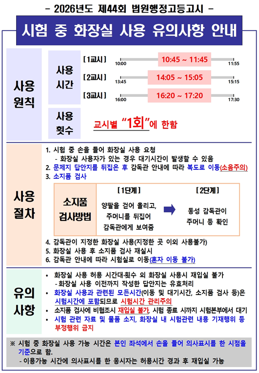 장애인 등 시험시간 연장 대상자의 경우 교시별로 최대 1.5배까지 시험 시간이 조정된다. 법원행정처는 시험 당일 시험실 내 전자기기 반입을 엄격히 제한하고, 휴대전화·스마트워치·태블릿PC 등 통신 및 전산기기 소지 시 부정행위로 간주해 무효 처리할 수 있다고 강조했다.