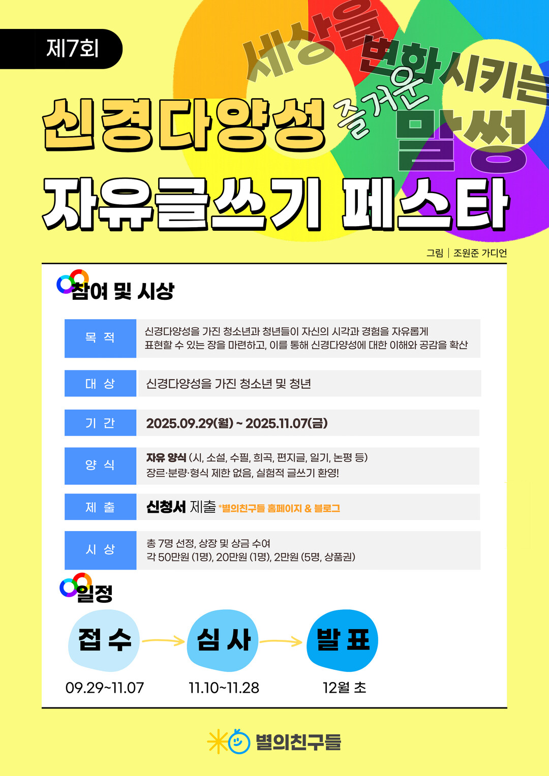 사단법인 별의친구들이 신경다양성을 주제로 한 글쓰기 축제인 ‘제7회 신경다양성 자유글쓰기 페스타’(a.k.a. 백일장)를 개최한다고 밝혔다.