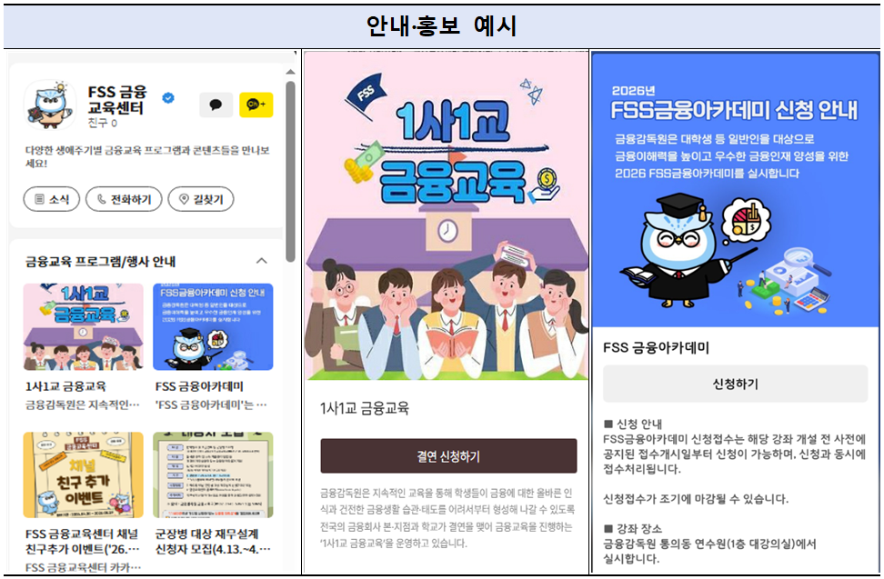채널에서는 금융감독원이 운영 중인 ‘FSS 금융아카데미’와 고령층·취약계층 대상 수시 방문교육 등 다양한 프로그램 정보도 함께 안내된다. 이용자들은 채널을 통해 교육 내용과 신청 방법 등을 확인할 수 있다.