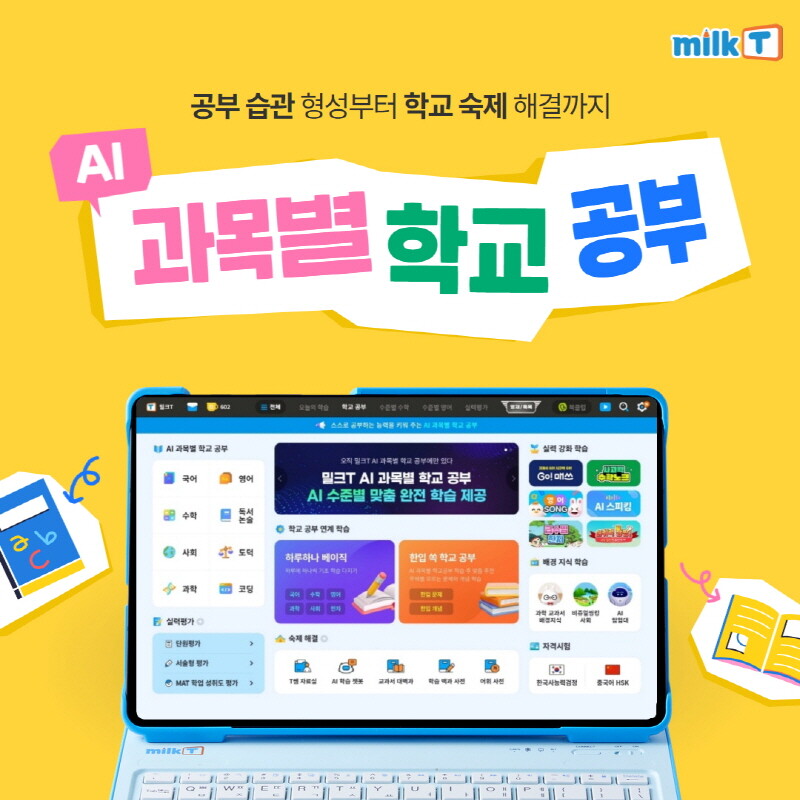 이에 천재교육 관계사 천재교과서가 만든 스마트학습지 밀크T는 ‘AI 과목별 학교 공부’를 통해 국영수사과 전 과목 학습은 물론 단원평가 대비 콘텐츠와 학교 숙제까지 해결해 주며 초등학생의 ‘완전 학습’을 지원하고 있다.