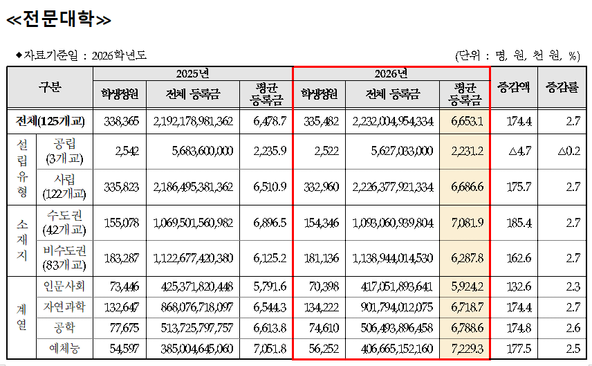 전문대 역시 수도권과 사립대 중심으로 등록금 부담이 컸다. 수도권 전문대 평균 등록금은 708만1900원으로 비수도권(628만7800원)보다 높았다. 사립 전문대 평균 등록금은 668만6600원인 반면 공립 전문대는 223만1200원 수준이었다.