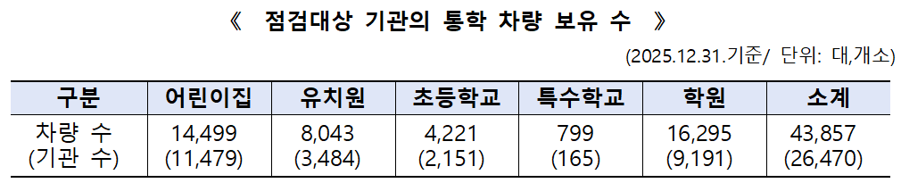 교육부는 국토교통부, 경찰청, 한국교통안전공단, 지방자치단체, 교육청과 함께 ‘2026년 어린이통학버스 합동 안전점검’을 실시한다고 밝혔다.