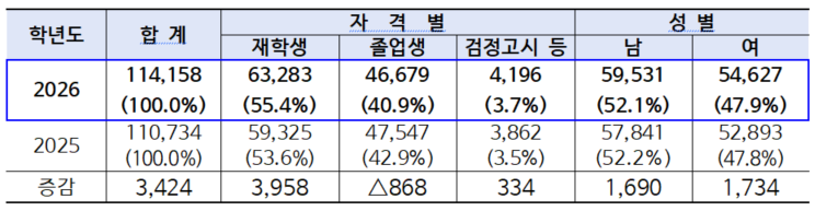 서울 지역 응시생 114,158명 응시, 재학생 63,283명(55.4%), 졸업생 46,679명(40.9%), 검정고시 등 기타 자격 4,196명(3.7%)