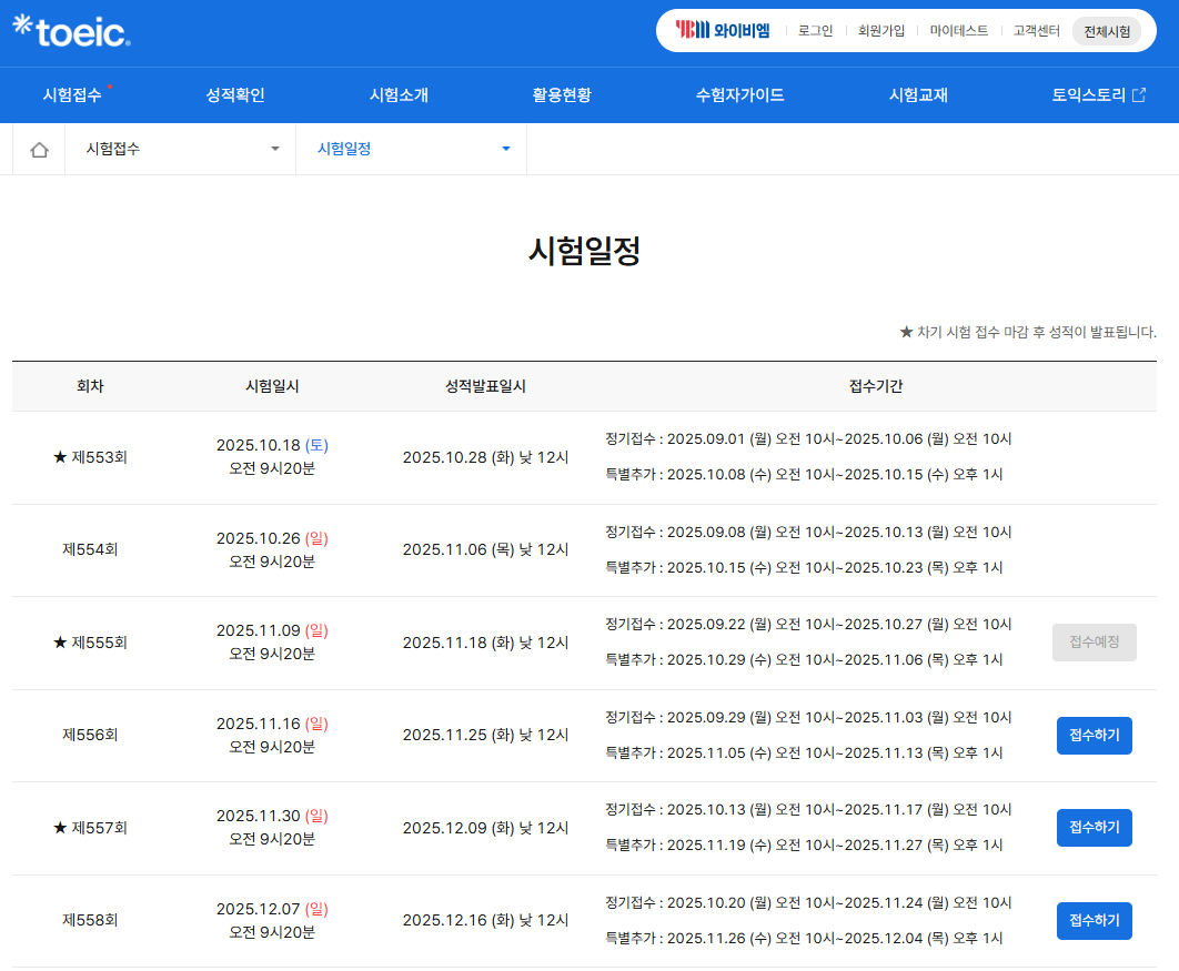 현재 YBM은 11월 16일(일), 30일(일), 12월 7일(일) 세 차례 토익 정기시험의 접수를 진행 중이다.