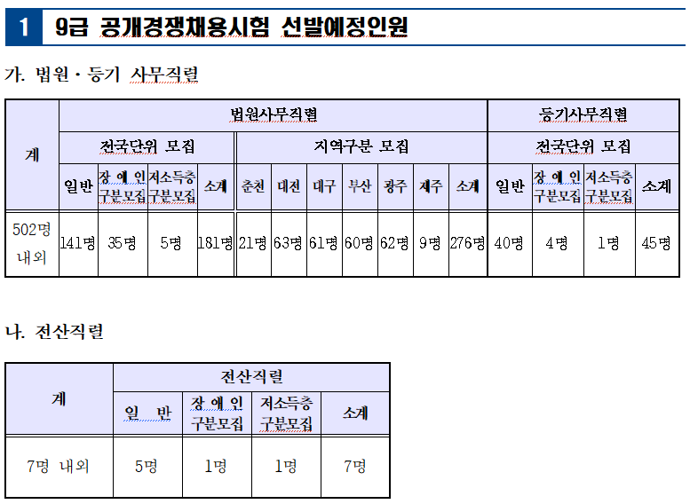 ▲9급 공개경쟁채용시험 선발예정인원(출처: 법원행정처)