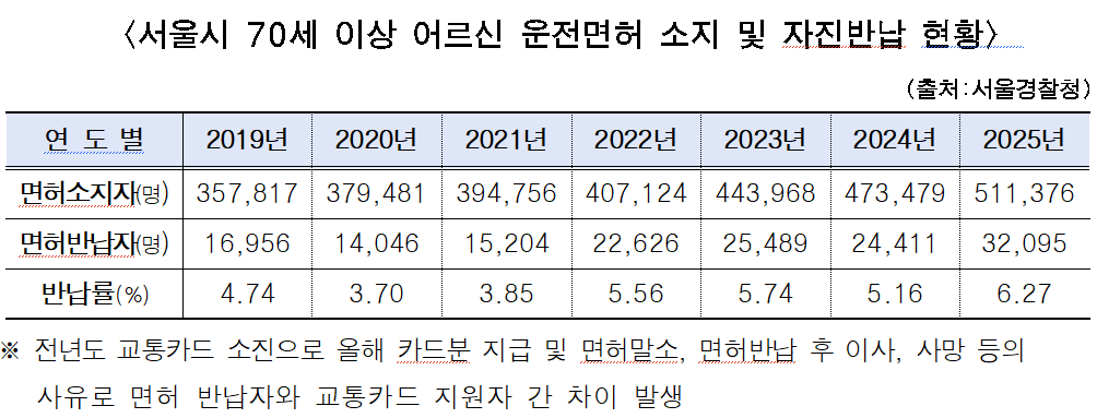 [피앤피뉴스=마성배 기자] 서울시가 고령운전자 교통사고를 줄이기 위해 추진해 온 ‘어르신 운전면허 자진 반납 교통카드 지원사업’을 올해는 예년보다 앞당겨 1월 말부터 시행한다. 매년 3월께 시작하던 사업을 조기 추진해 자발적인 면허 반납 참여를 확대하겠다는 취지다.