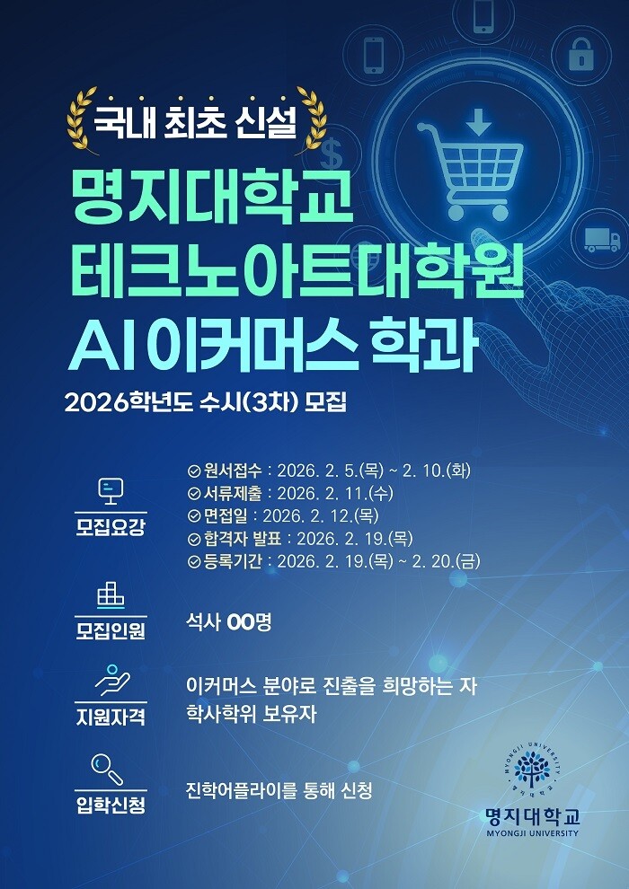 명지대학교 테크노아트대학원 AI 이커머스학과가 2026학년도 수시(3차) 최종 모집을 진행한다. 이번 모집은 2026년 2월 5일(목)부터 2월 10일(화)까지 원서 접수가 가능하며, 이번 수시(3차)가 2026학년도 마지막 모집이다.