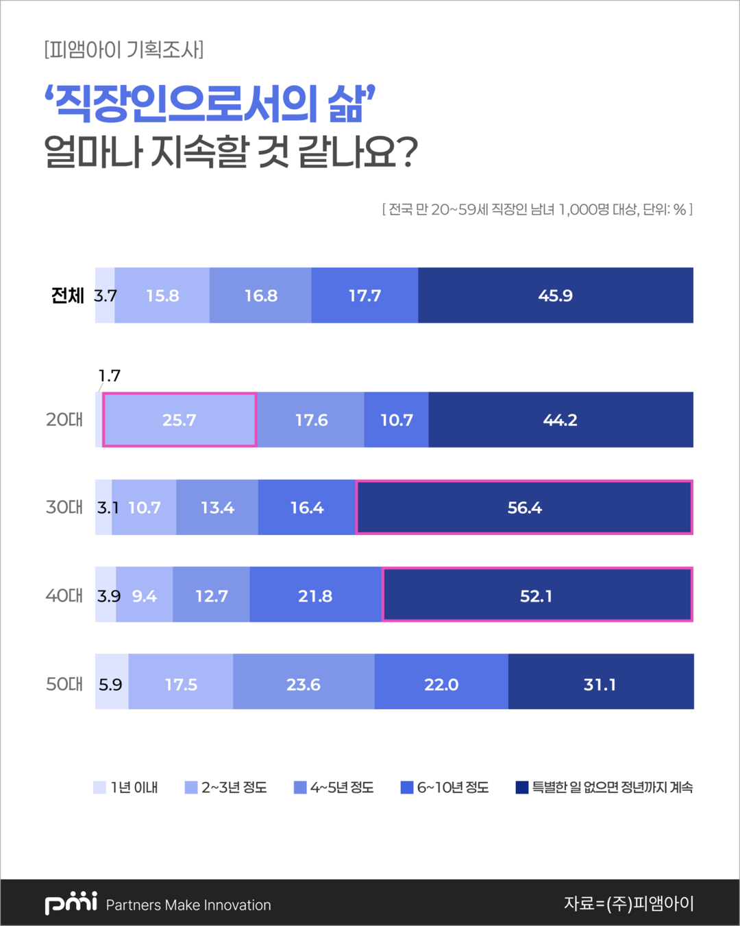 ‘앞으로 직장생활을 얼마나 더 할 건가’라는 질문에 전체 45.9%가 ‘정년까지’를 선택했다. 특히 30·40대는 안정적 커리어 지속을 선호하는 경향이 두드러졌다.