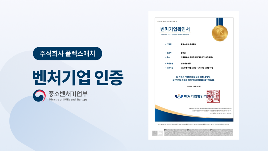 이번 인증은 기술 혁신성과 사업 성장성을 모두 충족한 기업에 부여되는 제도로, 기술력·시장성·비즈니스 모델·특허·기업가정신 등 14개 지표를 종합적으로 평가해 선정된다. 플렉스매치는 AI 기술을 중심으로 한 데이터 분석 및 자동화 역량, 플랫폼 기술 고도화 측면에서 우수한 평가를 기반으로 벤처기업 인증을 획득했다.