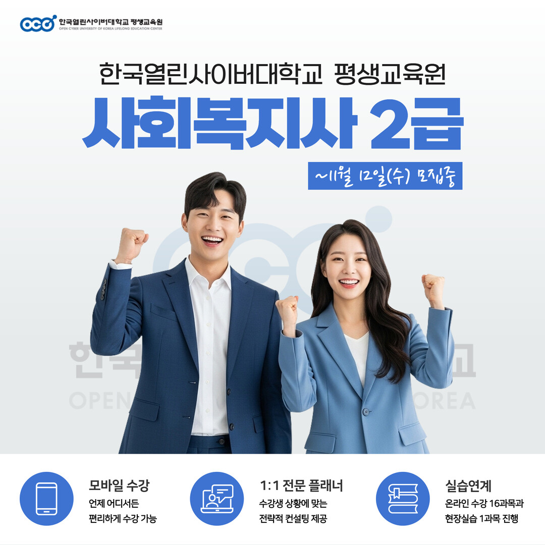 현재 사회복지사 2급 자격 취득 과정은 오는 11월 12일(수)까지 모집 중이며, 개강일은바로 다음 날인 11월 13일(목)이다. 자세한 내용은 한국열린사이버대학교 평생교육원 공식 홈페이지에서 확인할 수 있다.