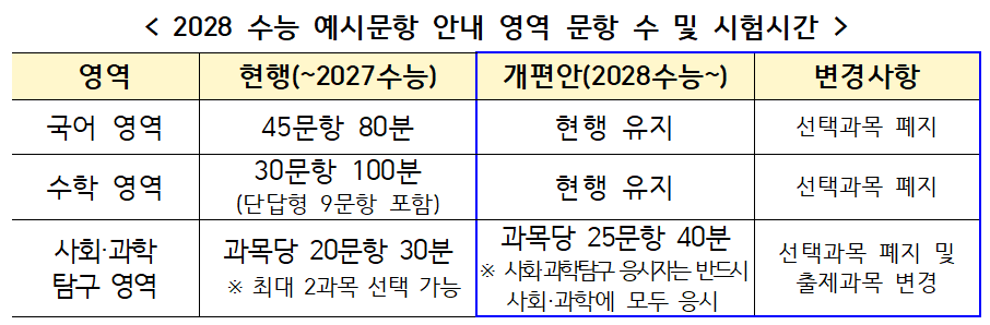 2028학년도 수능에서는 국어, 수학, 사회·과학탐구 영역에서 선택과목이 완전히 폐지된다. 국어는 ‘화법과 언어’, ‘독서와 작문’, ‘문학’ 세 과목을 기반으로 45문항 80분간 시험을 본다. 수학은 ‘대수’, ‘미적분Ⅰ’, ‘확률과 통계’를 공통으로 출제하며, 30문항 중 약 30%는 단답형 문항으로 구성되며, 시험시간은 100분이다.