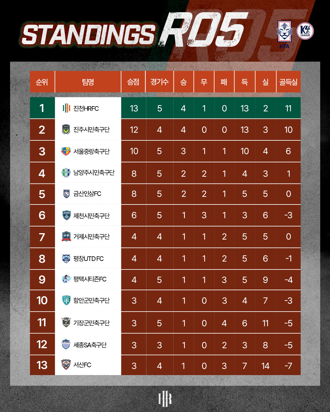 | ▲2026 K4리그 5라운드 기준 순위에서 신생팀 진천 HR FC가 승점 13점으로 단독 1위를 기록하며 선두를 달리고 있다. / 제공: HR레포츠㈜ 미디어팀 |