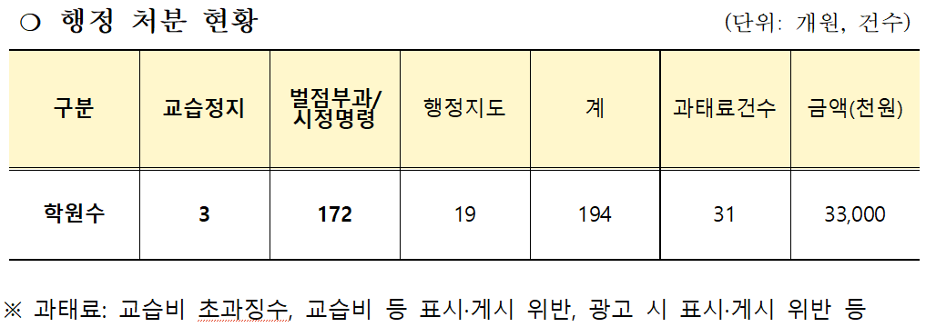 교습정지 처분은 3건 내려졌고, 벌점 부과 및 시정명령은 172건이었다. 행정지도는 19건 실시됐다.