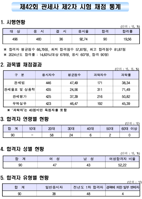 [피앤피뉴스=마성배 기자] 2025년도 제42회 관세사 제2차 시험에 460명이 응시해(응시율 92.74%) 90명이 최종 합격, 합격률은 19.56%로 지난해(14.83%)보다 4.73%포인트 상승했다.