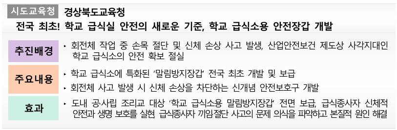 시·도교육청 부문에서는 경상북도교육청의 ‘학교 급식소용 말림방지장갑 개발’이 전국 최초 사례로 주목을 받았다. 회전체 작업 과정에서 손목 절단 등 사고가 발생했던 학교 급식소에 특화된 보호 장비를 개발해 보급한 것이다. 급식종사자 전원에게 장갑을 지급함으로써 끼임·절단 사고 위험을 실질적으로 차단하며, 급식 안전의 새로운 기준을 마련했다.